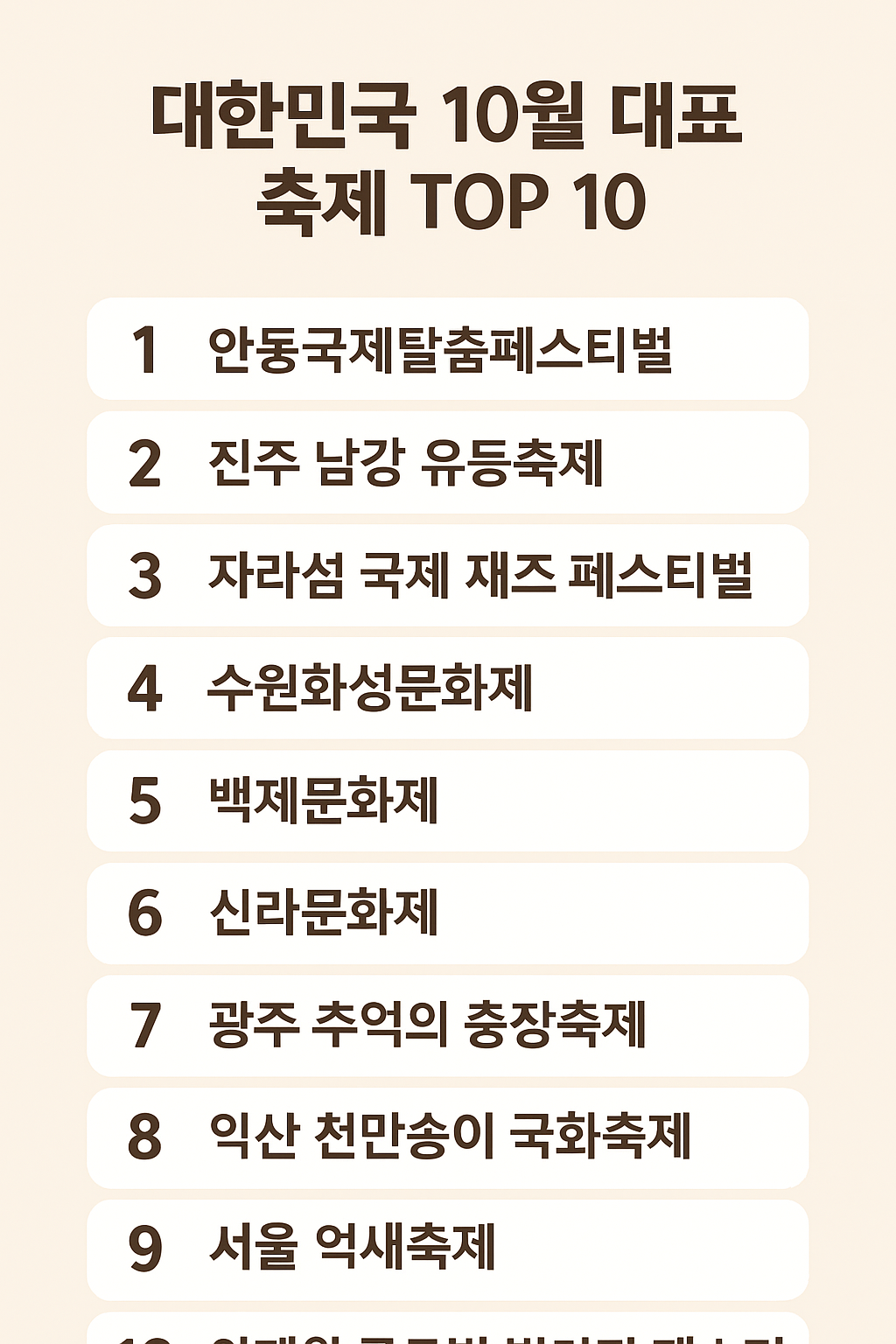 본 글에서는 대한민국 10월 대표 축제 TOP 10을 소개합니다.