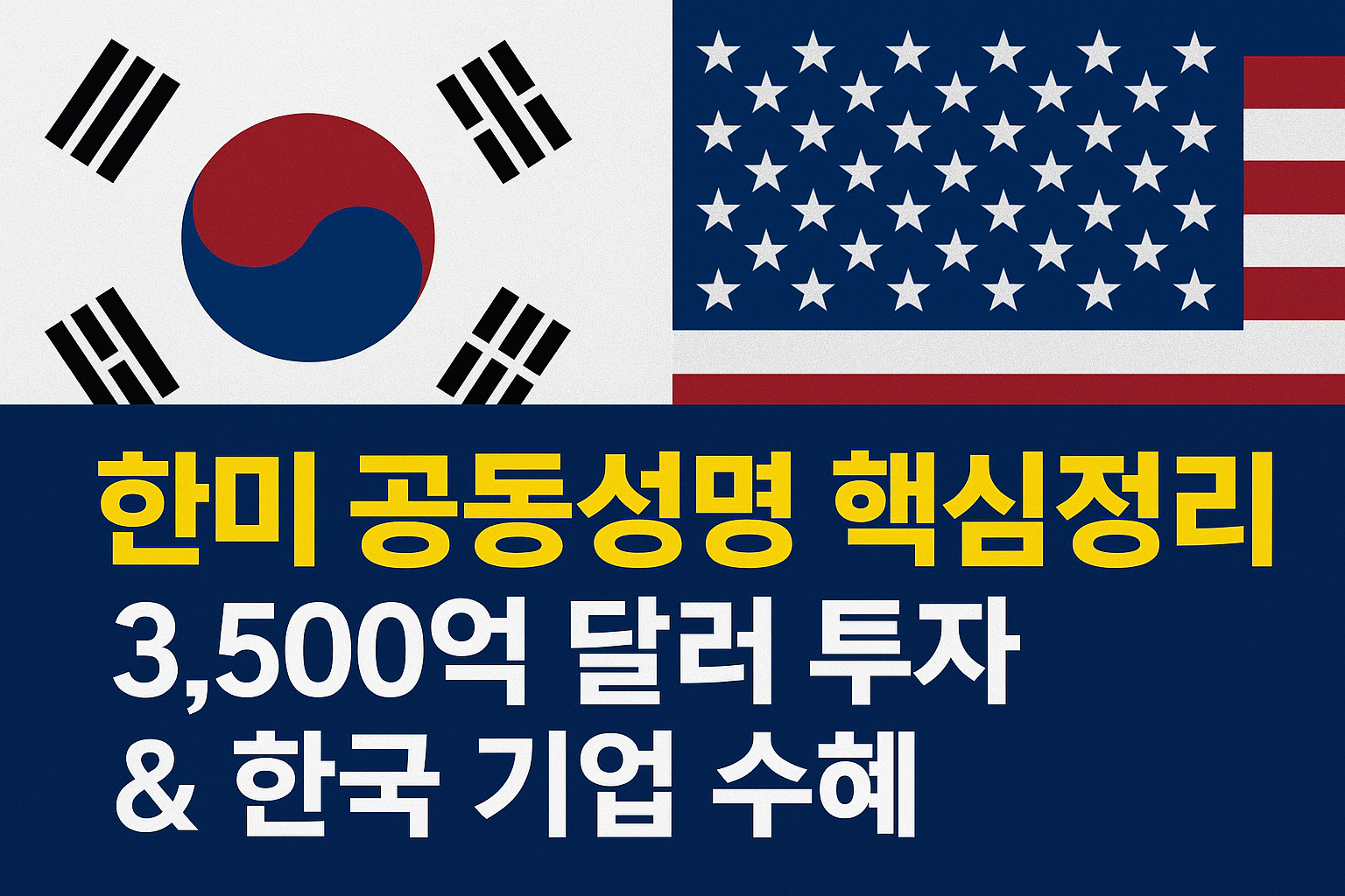 한미 공동성명 핵심 요점 총정리. 3,500억 달러 투자, 관세 완화, 반도체·전기차·2차전지·원전·조선·항공 산업 수혜 기업 분석. 삼성전자·하이닉스·현대차·기아·HD현대중공업·두산에너빌리티 등 주요 기업 전망을 한눈에 확인하세요.