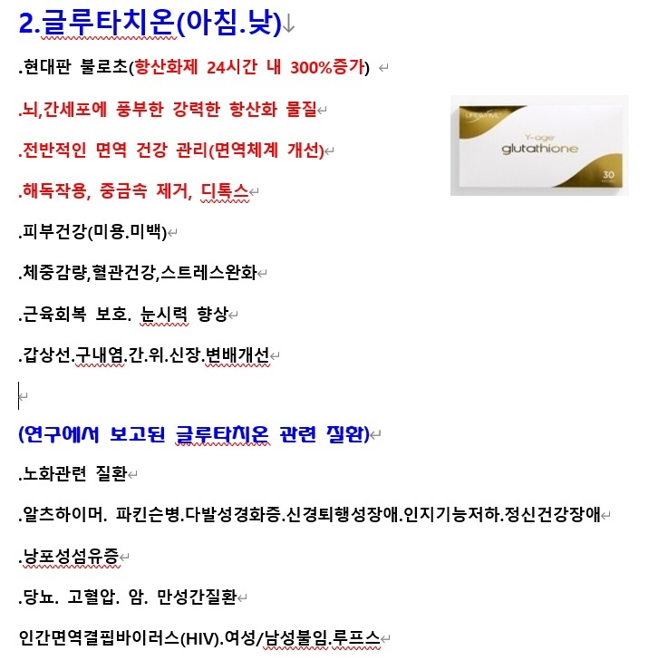 글루타치온은 독소배출, 피부미백, 면역강화, 감상선, 간, 위, 신장, 변비에 도움을 준다.