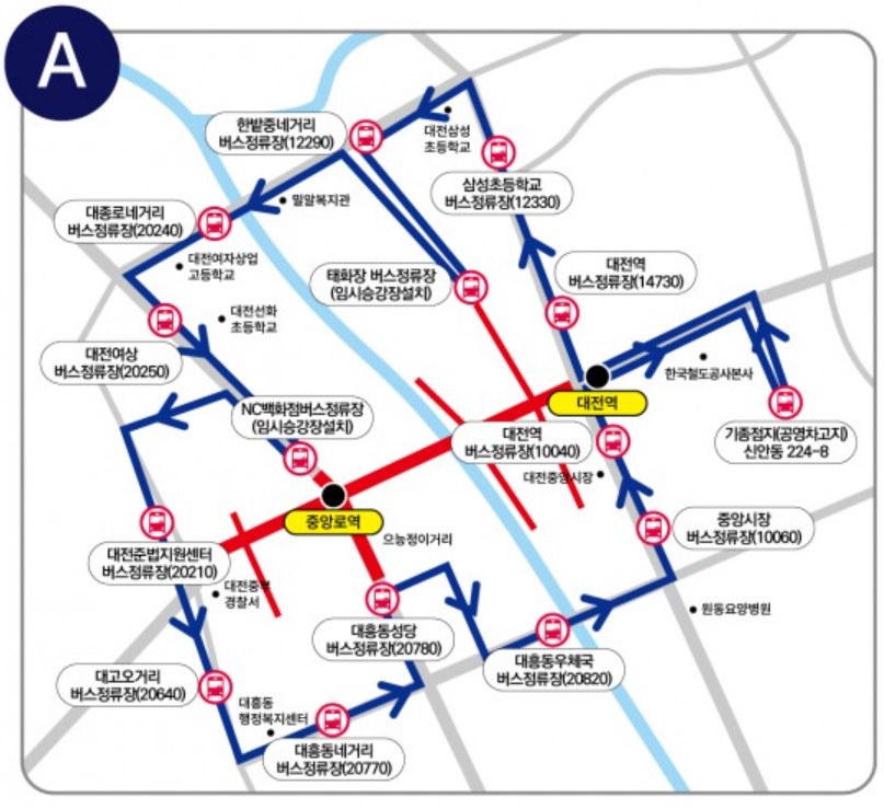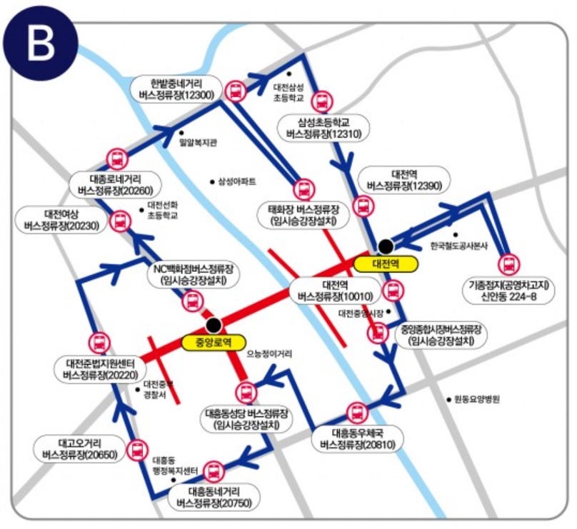 대전역 - 삼성초 - 한밭중네거리 - 태화장 - 대종로네거리 - 대전여상 - NC백화점 - 준법지원센터 - 대고오거리 - 대흥동네거리 - 대흥동성당 - 대흥동우체국 - 중앙시장 - 대전역