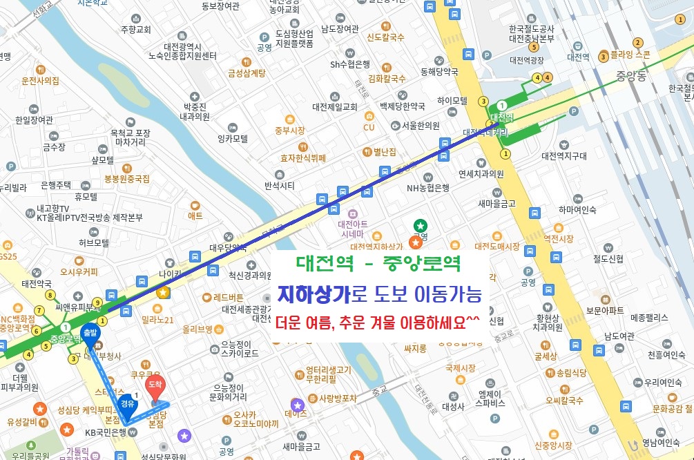 지하철 대전역과 중앙로역이 지하상가로 연결 되어있어 기차역에서 내리시면 밖으로 안 나가고 이동 하실 수 있어